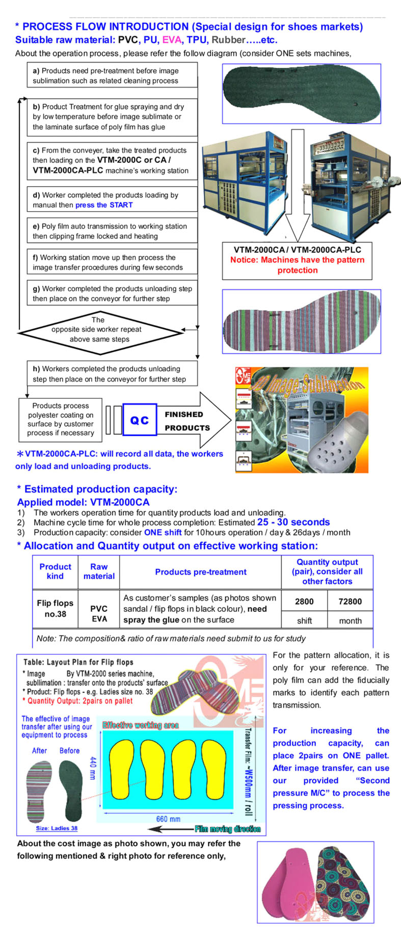 本工藝可解決在立體/曲面的產(chǎn)品表面上(如:筆記本計(jì)算機(jī)、i-phone、塑料產(chǎn)品外殼、行李箱,MP4,EVA花園鞋、人字拖鞋、涼鞋、不同材質(zhì)的休閑鞋)印刷圖案,通過此-立體真空熱轉(zhuǎn)印機(jī)械-將轉(zhuǎn)印膜上的精美平面圖像..清晰亮麗地展現(xiàn)出來。這新技術(shù)可幫助顧客節(jié)省費(fèi)用和得到最優(yōu)秀與最耐久的圖像。